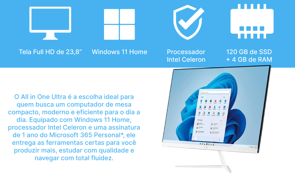 Conteúdo da Embalagem 1 Computador All in One Ultra Multilaser 23,8” Celeron N4020 4GB 120GB SSD Windows 11 Home
