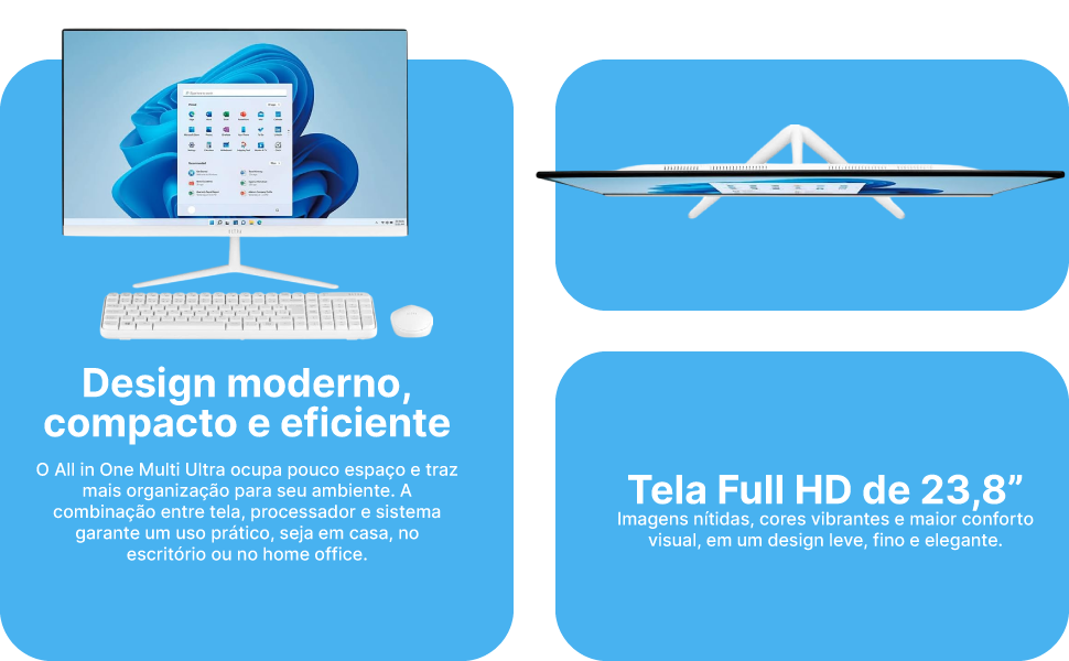 Com um visual elegante e minimalista, o All in One Ultra combina desempenho e estilo. Seu design leve e fino economiza espaço e se adapta perfeitamente a qualquer ambiente, seja em casa ou no escritório. A tela de 23,8 polegadas Full HD proporciona imagens nítidas e cores vibrantes, garantindo conforto visual durante o uso prolongado em trabalho, estudos ou lazer.