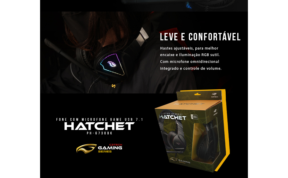 Hatchet e o headset gamer da C3Tech que tras o audio a seu favor. Com drivers de 50mm voce ouve o que os concorrentes nao escutam, junto a qualidade do som surround 7.1 que possibilita imersao e te transporta para dentro do jogo. Seu design arredondado e as faixas de iluminacao RGB e estiloso e preza conforto digno de profissionais.
