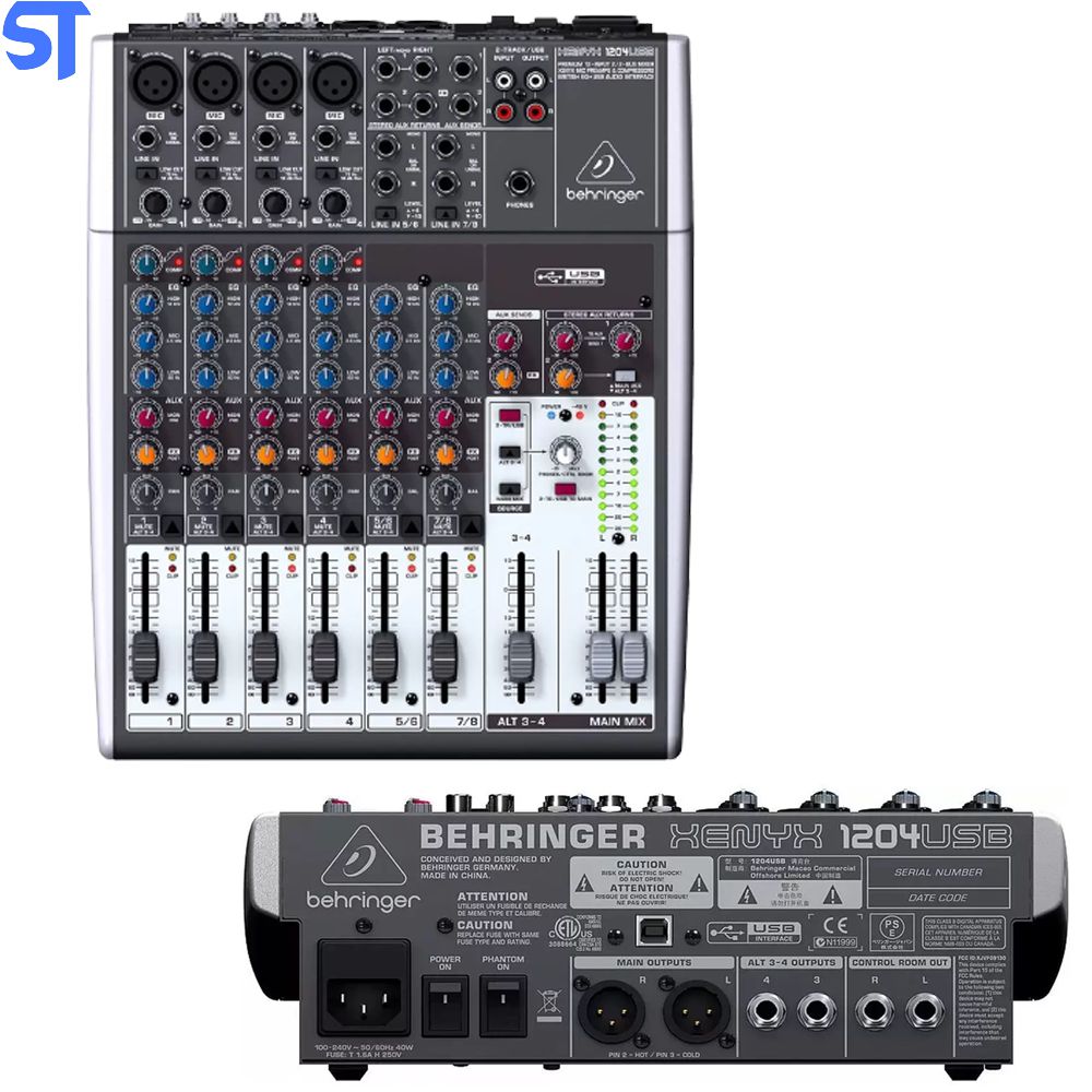 Behringer - XENYX 1204USB Mixer com 4 canais XLR pré-amplificadores + 2 canais estéreo, compressores de microfone XENYX, equalizadores britânicos e interface USB / áudio. Características: Mixer analógico de baixo ruído e alto headroom premium 4 pré-amplificadores de microfone XENYX com alimentação fantasma de ponta, comparáveis aos pré-amplificadores de boutique independentes 4 compressores de nível de estúdio com funcionalidade "um botão" super fácil e LED de controle para som vocal e instrumental profissional EQs "britânicos" neoclássicos de 3 bandas para som quente e musical Interface USB / Áudio estéreo incorporada para conectar diretamente ao seu computador. Software de gravação, edição e podcasting de áudio, mais 150 plug-ins de instrumento / efeito e driver de latência ultra-baixa, disponíveis para download no site da behringer 2 envios auxiliares por canal: 1 pré-fader para aplicativos de monitoramento, 1 pós-fader para dispositivos FX externos Clip LEDs e mudo / alt 3-4 funcionam em todos os canais 2 subgrupos com saídas separadas para maior flexibilidade de roteamento 2 retornos aux estéreo multifuncionais com roteamento flexível Saídas de mix principal balanceadas com conectores XLR banhados a ouro, além de sala de controle separada, fones de ouvido e saídas de fita estéreo Saídas da sala de controle / telefones com matriz de fonte de múltiplas entradas Faders de afiar logarítmico de 60 mm e controles rotativos selados Suportes de montagem em rack incluídos para máxima flexibilidade