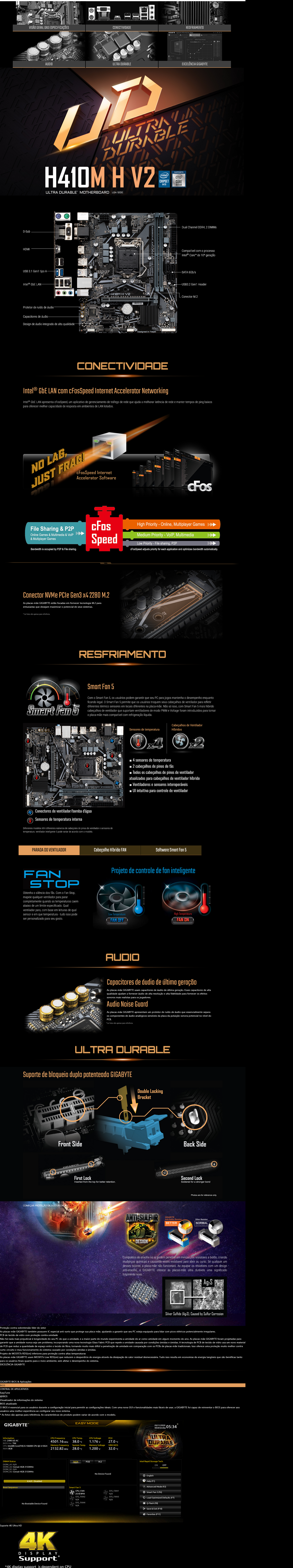 A H410M H V2 vem equipada com portas HDMI e D-Sub (VGA), permitindo conexão simultânea a múltiplos monitores. Também oferece portas USB 3.2 Gen 1, garantindo transferências rápidas de dados, e áudio de alta definição com capacitores dedicados, proporcionando som limpo e realista. Seu sistema de rede LAN Gigabit integrado garante conexão estável e veloz, ideal para jogos online, videoconferências e streaming.