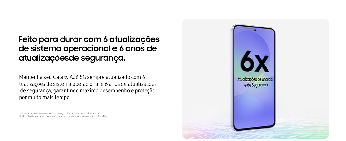 Além disso, o aparelho conta com suporte para 6 atualizações principais do sistema Android e 6 anos de patches de segurança, garantindo longevidade e atualização constante.
