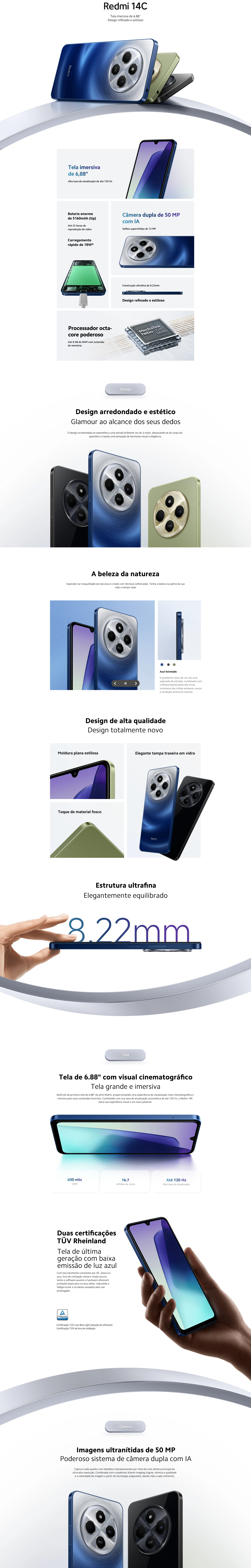 - Conteúdo da Embalagem: 1 Redmi 14C, carregador padrão brasileiro, cabo USB-C, capa protetora, ferramenta ejetora de chip, manual, termo de garantia