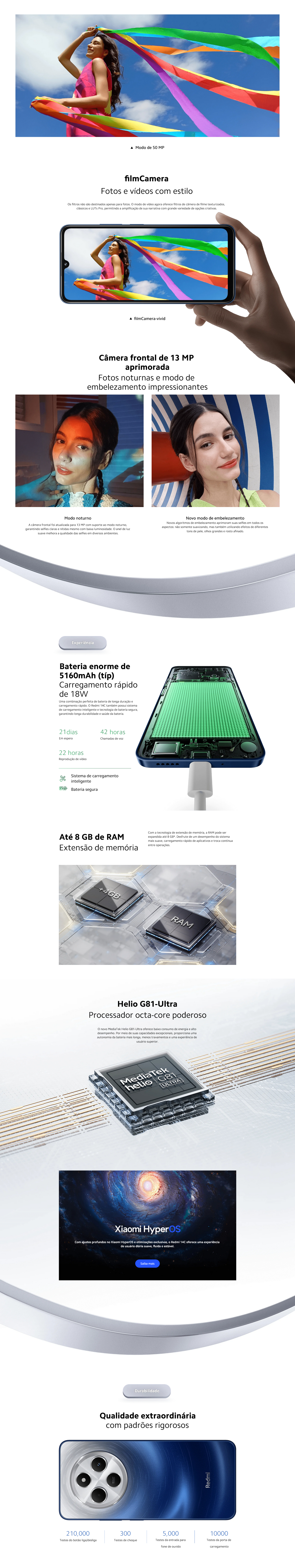 Capture momentos com detalhes impressionantes usando a câmera traseira de 50MP com IA, que suporta modo noturno, HDR, retrato com desfoque ajustável e gravação em 1080p a 30fps. A câmera frontal de 13MP com modo embelezamento e anel de luz suave garante selfies de qualidade e videochamadas nítidas. Recursos como modo 50MP e time-lapse elevam a criatividade, enquanto o reconhecimento facial e o sensor de impressão digital lateral oferecem segurança ágil, tornando o Redmi 14C um aliado versátil para fotografia e privacidade no dia a dia.